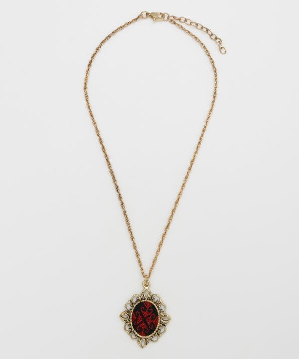 刺しゅう柄が目を惹く、存在感あるロマニアネックレス。アンティーク調のフレームとモチーフが調和し、装いに華やかなアクセントを添えます。