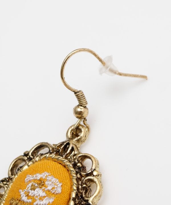 民族調の存在感が光る、アンティーク感ただようピアス。繊細な刺しゅう風モチーフと大ぶりのデザインが顔まわりを彩るアクセントに。