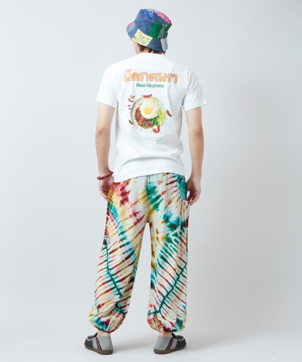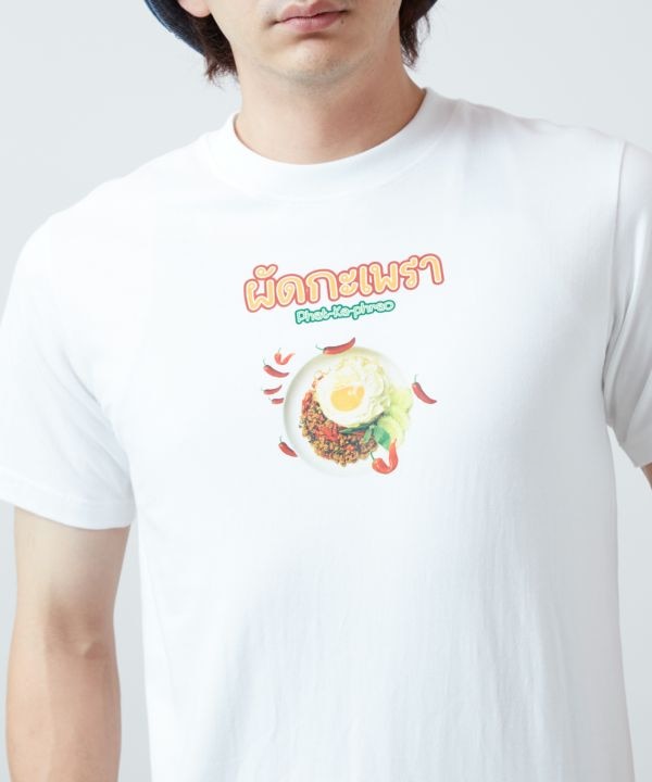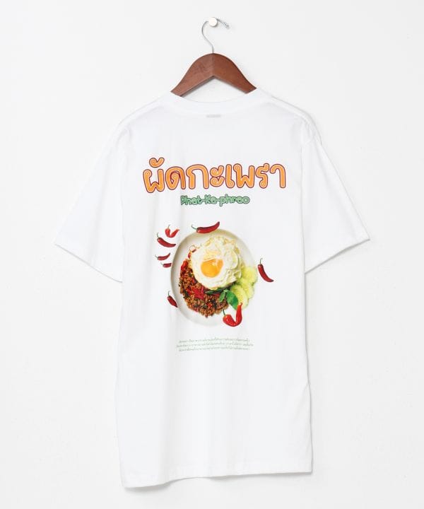 【タイ直輸入】ガパオライスをモチーフにした遊び心あふれるTシャツ。前後にユニークなイラストがプリントされ、くすっと笑えるデザインが魅力。エスニックフードマーケットをテーマにしたユニセックスアイテム。