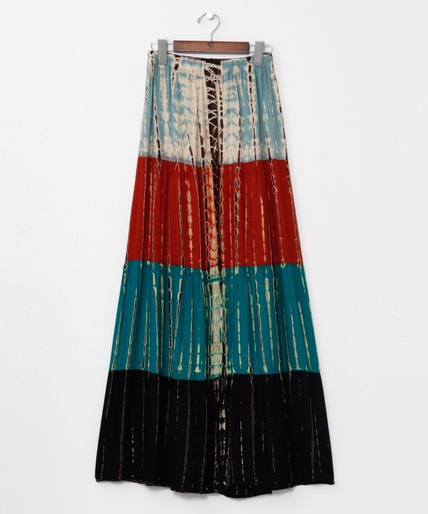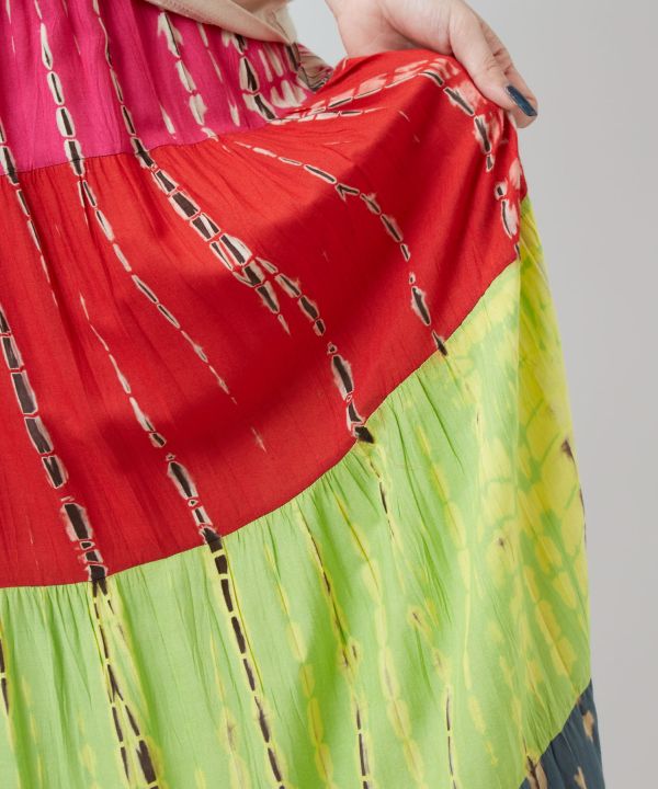 【タイ直輸入】絞り染めが目を惹くティアードスカート。肌触り優しいレーヨン生地で快適な着心地。4段の色絞りと動きのあるシルエットが存在感を演出。※タイダイ染めの特性上、色の出方や風合いが一つ一つ異なります。