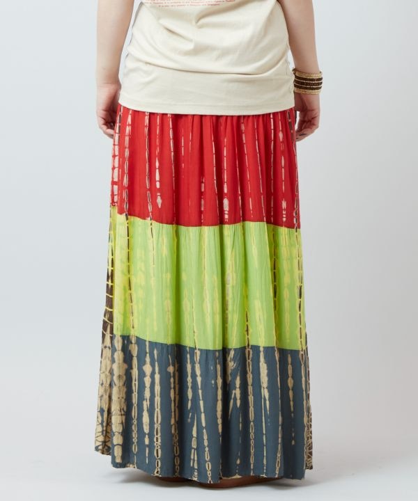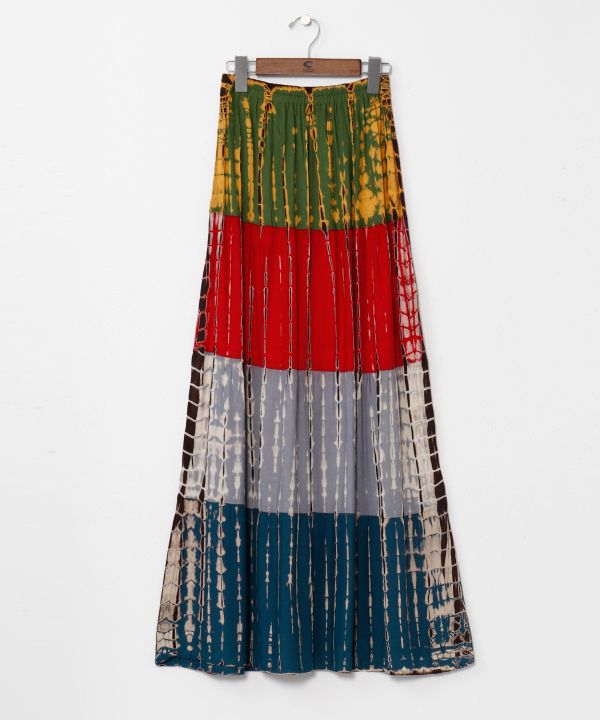 【タイ直輸入】絞り染めが目を惹くティアードスカート。肌触り優しいレーヨン生地で快適な着心地。4段の色絞りと動きのあるシルエットが存在感を演出。※タイダイ染めの特性上、色の出方や風合いが一つ一つ異なります。