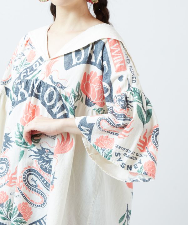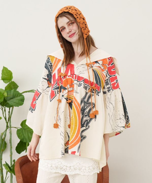 【タイ直輸入】タイ広告柄が目を惹くレディーストップス。肌触りの良いタイコットン素材とセーラー襟デザインで、一枚でコーデが決まる存在感。個性派スタイルを楽しみたい方におすすめ。