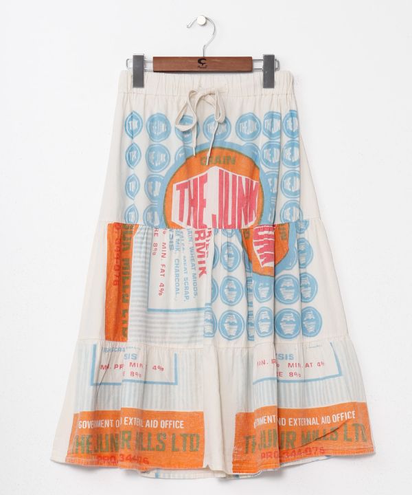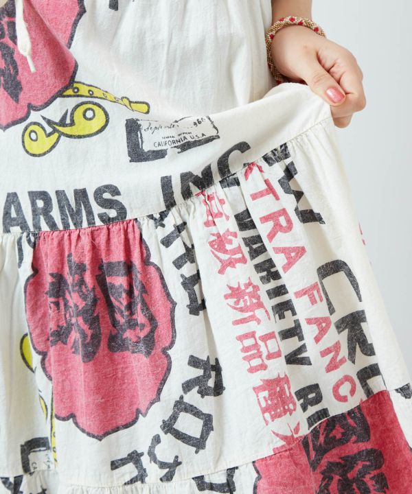 【タイ直輸入】広告柄が映えるミディアム丈ティアードスカート。タイコットンの風合いと軽やかなシルエットで、涼しく履ける一枚。短丈で足元すっきり、ウエストは紐で調整可能。