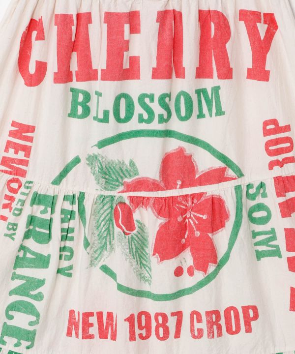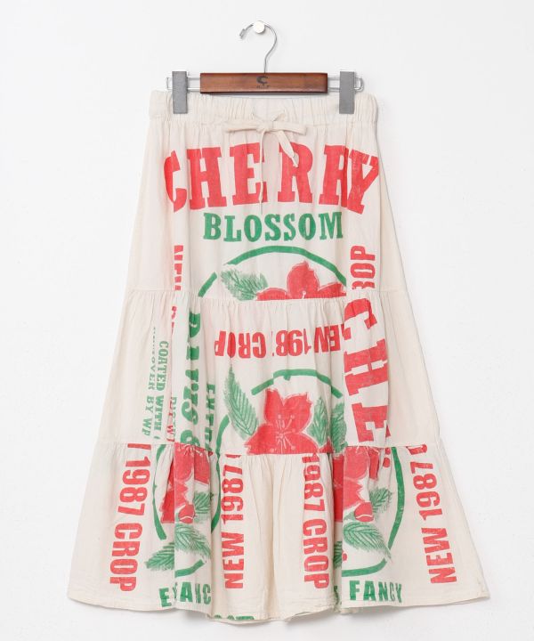 【タイ直輸入】広告柄が映えるミディアム丈ティアードスカート。タイコットンの風合いと軽やかなシルエットで、涼しく履ける一枚。短丈で足元すっきり、ウエストは紐で調整可能。