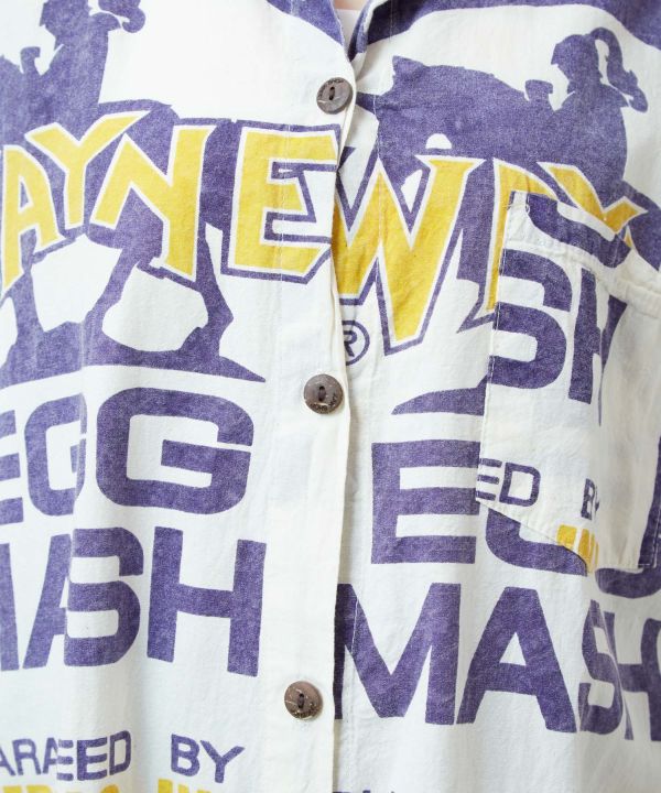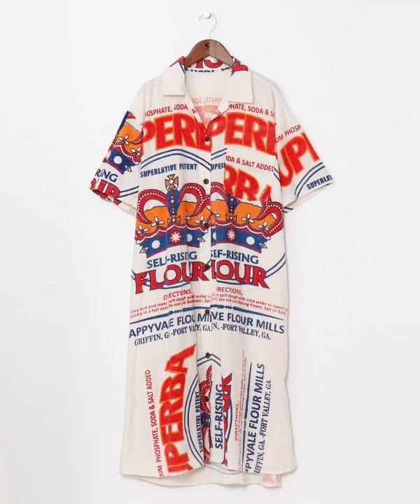 【タイ直輸入】大胆な広告柄が魅力のシャツワンピース。前開き仕様で羽織りとしても使える2WAYデザイン。柔らかく風合いのあるタイコットン素材で、コーデの幅が広がる一枚。