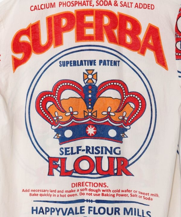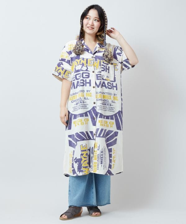 【タイ直輸入】大胆な広告柄が魅力のシャツワンピース。前開き仕様で羽織りとしても使える2WAYデザイン。柔らかく風合いのあるタイコットン素材で、コーデの幅が広がる一枚。