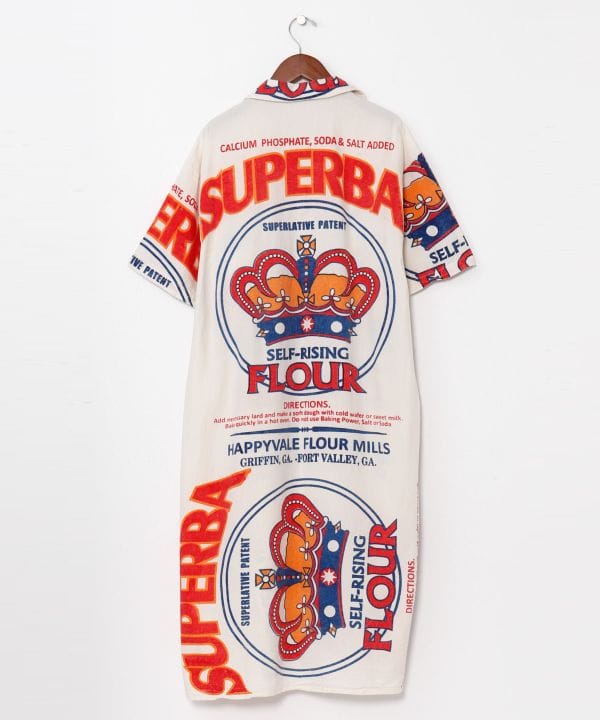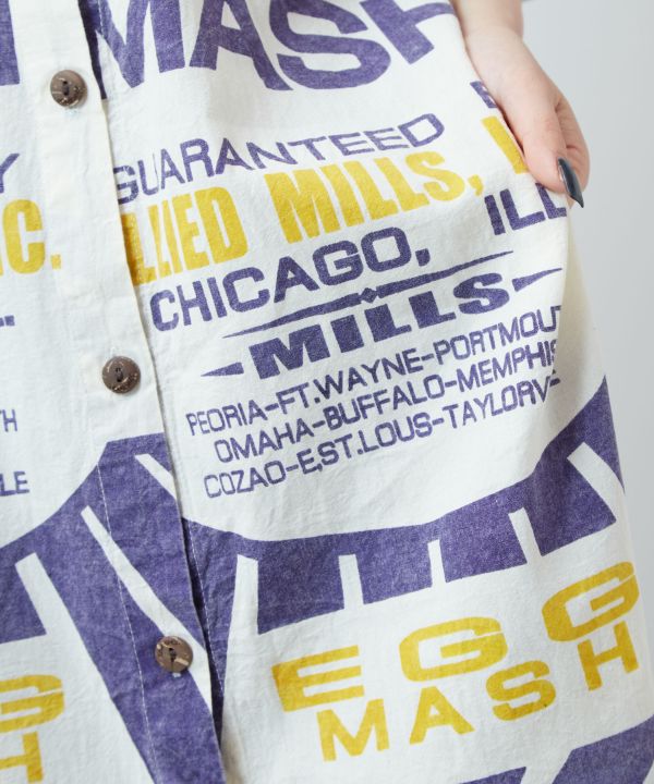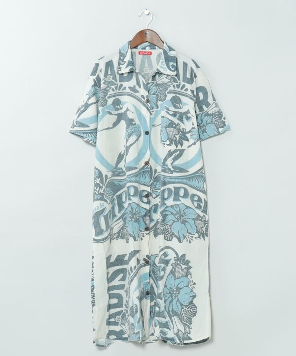 【タイ直輸入】大胆な広告柄が魅力のシャツワンピース。前開き仕様で羽織りとしても使える2WAYデザイン。柔らかく風合いのあるタイコットン素材で、コーデの幅が広がる一枚。