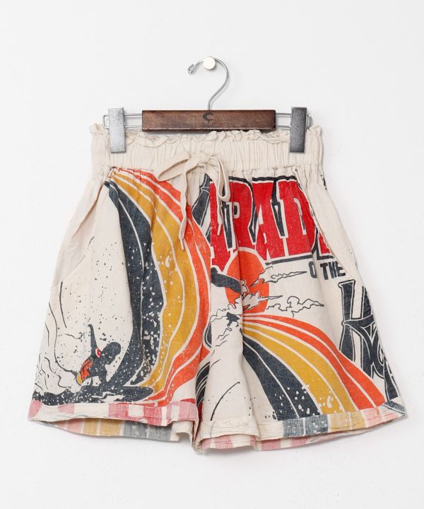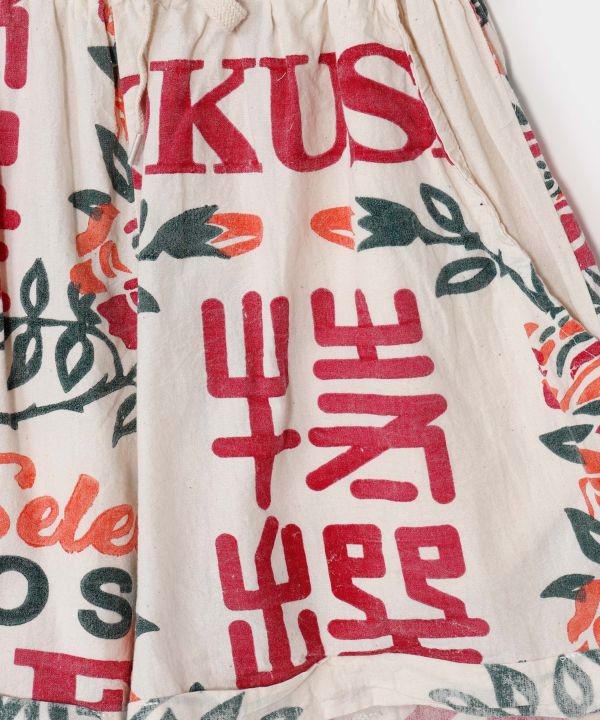 【タイ直輸入】タイの広告をプリントしたユニークなデザインが魅力のハーフパンツ。風合いの良いタイコットンで涼しく快適。存在感のある柄でトップスを選ばずコーデの主役に。ウエスト紐調整可。