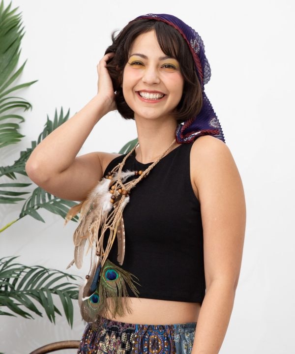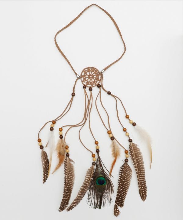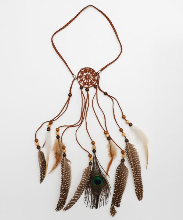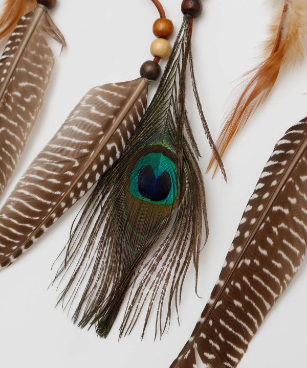 フェザーを贅沢にあしらったドリームキャッチャー風ネックレス。存在感ある長めのモチーフが印象的で、胸元を華やかに飾る主役級アクセサリー。