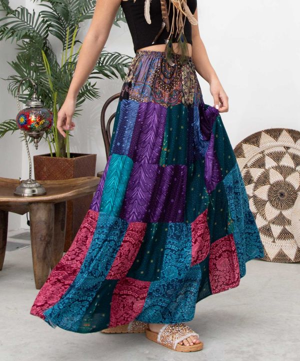 【タイ直輸入】豪華なパッチワークが存在感を放つスカート。曼荼羅やピーコック柄などエスニック柄を贅沢に使用したデザイン。※一点一点色味が異なるアソート商品です。※写真は一例です。