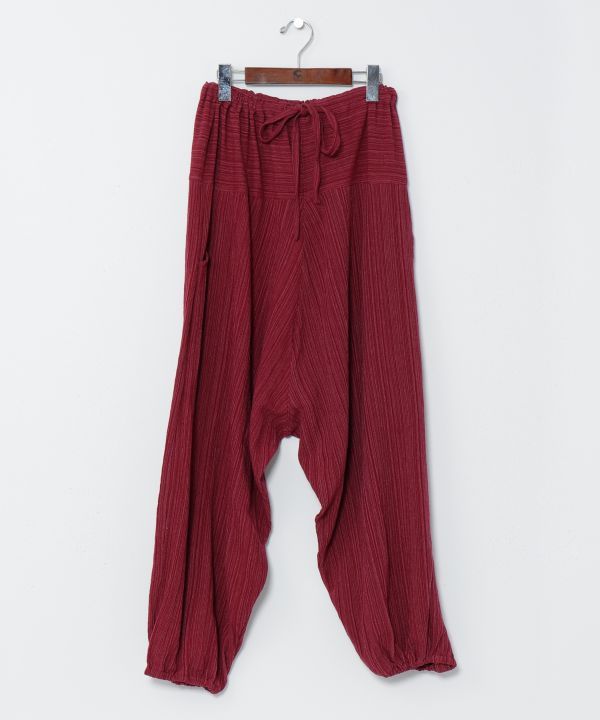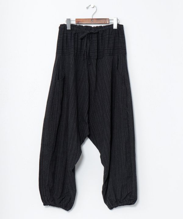 豊富なカラー展開が嬉しいタイコットン100%のサルエルパンツ。主張しすぎないさり気ないストライプ柄がアクセントに。左右にポケットが付き、ウエストはゴムと紐でサイズ調整が可能。裾にもゴムが入りシルエットや丈を好きに変える事が出来る。殿堂入りサルエルパンツ。