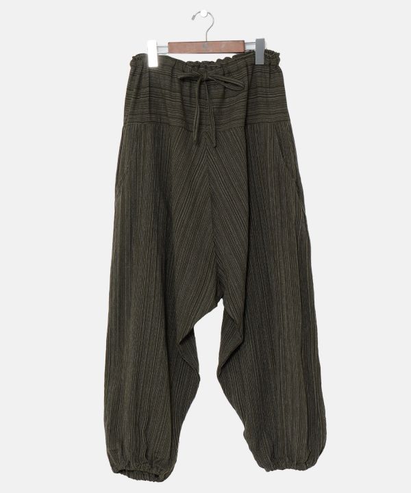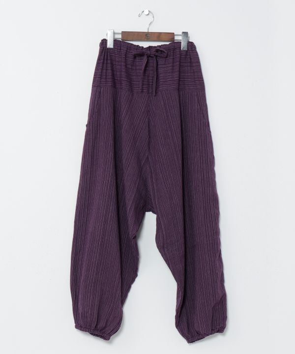 豊富なカラー展開が嬉しいタイコットン100%のサルエルパンツ。主張しすぎないさり気ないストライプ柄がアクセントに。左右にポケットが付き、ウエストはゴムと紐でサイズ調整が可能。裾にもゴムが入りシルエットや丈を好きに変える事が出来る。殿堂入りサルエルパンツ。