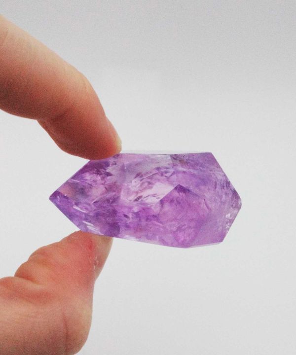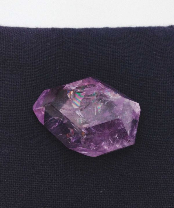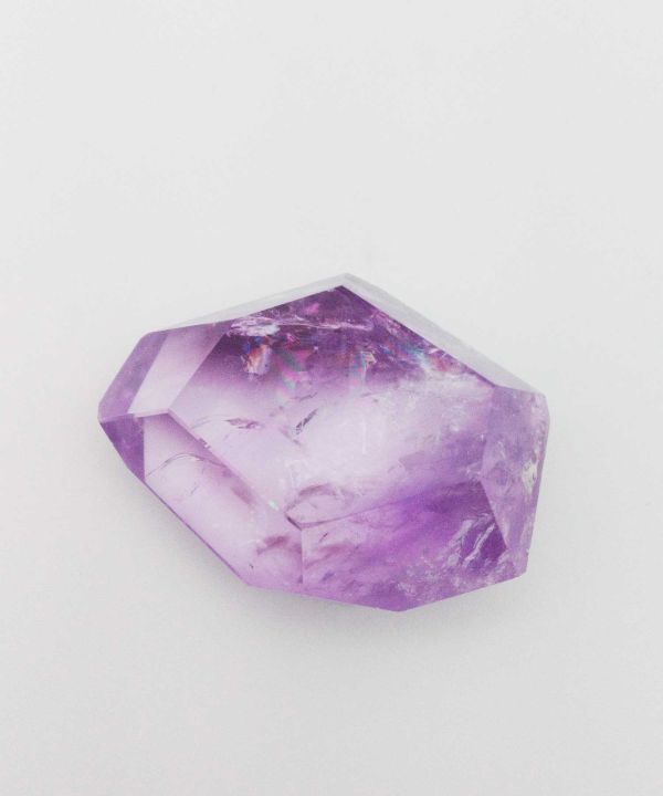 小ぶりながらもしっかりと存在感を放つ、鮮やかな紫が魅力のブラジル産アメジストの一点ものフリーカット。手のひらに収まるほどのサイズながら、光を受けるとやわらかく輝き、お部屋にそっと置くだけでぱっと明るさを添えてくれます。自然な形に沿って仕上げられたフリーカットの内部には虹色の光が浮かぶインクルージョンが見られ、角度によって七色の輝きが現れる神秘的な表情が特徴です。淡く透明感のある紫が優しい印象を与え、窓辺やライトのそばに置くと虹がより美しく際立ちます。天然石ならではの小さな欠けが虹を生み出しており、その石だけが持つ唯一無二の個性としてお楽しみいただけます。