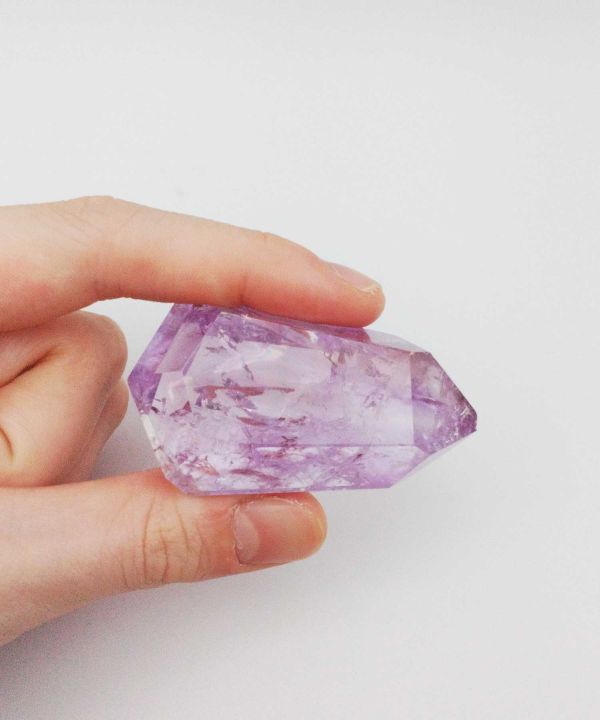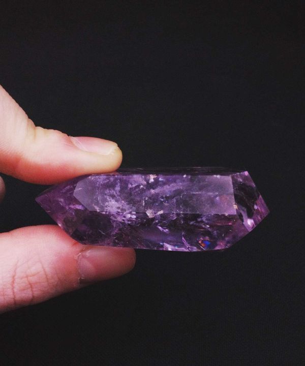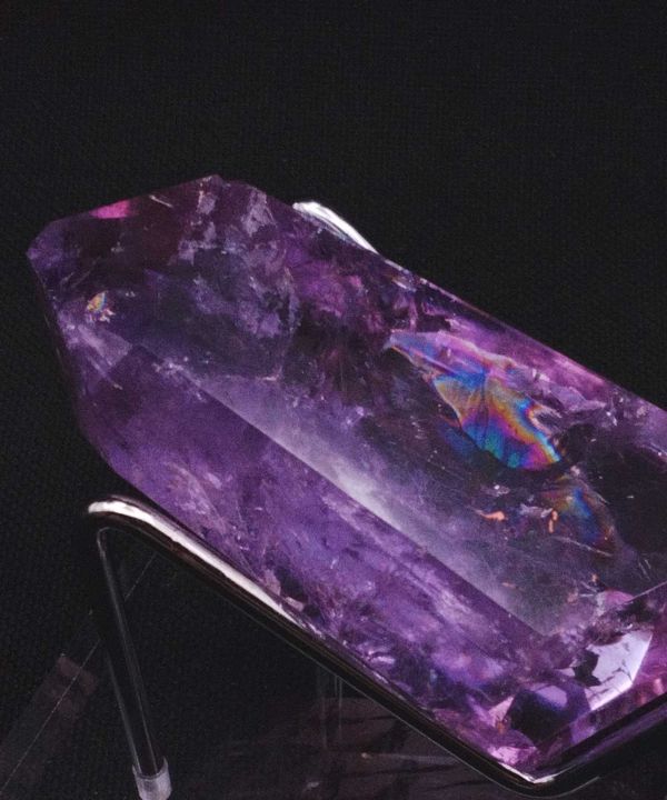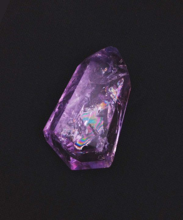 凛とした縦長のフォルムに、角度によって浮かび上がる虹が映えるブラジル産アメジストの一点ものフリーカット。光を当てるたびに七色の輝きが現れ、幻想的で心が浄化されるような表情を見せてくれます。淡く透明感のある紫が優しく、眺めるだけで癒しと彩をもたらす存在です。自然な形に沿って仕上げられたフリーカットの内部には虹色のインクルージョンが内包され、窓辺やライトのそばに置くとその美しさがより際立ちます。天然石ならではの小さな欠けが虹を生み出しており、その石だけが持つ唯一無二の個性としてお楽しみいただけます。