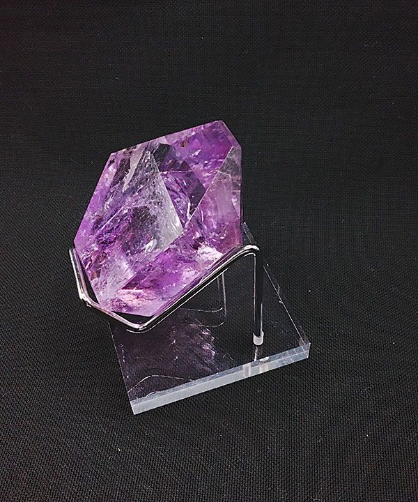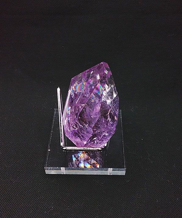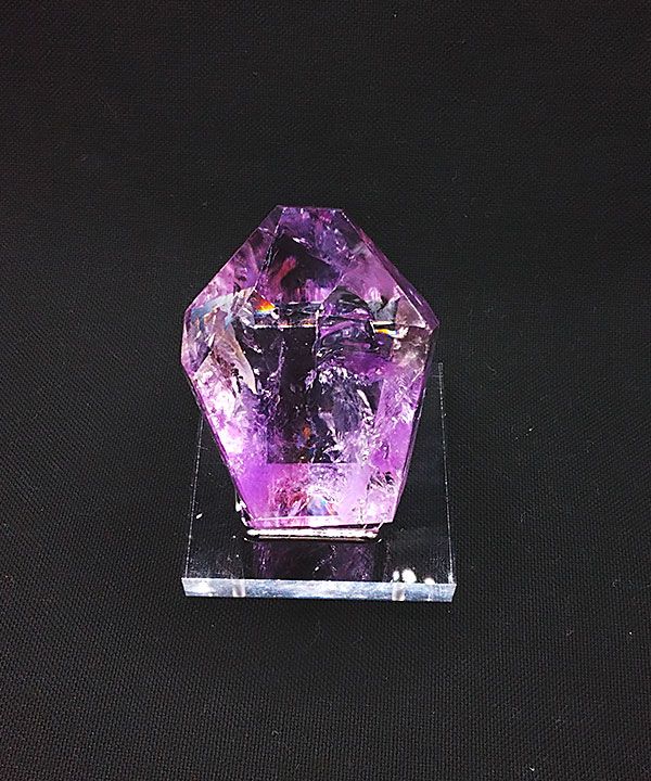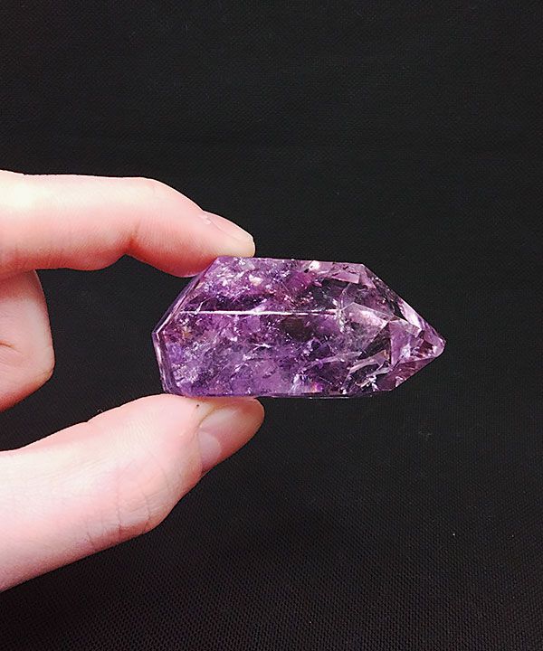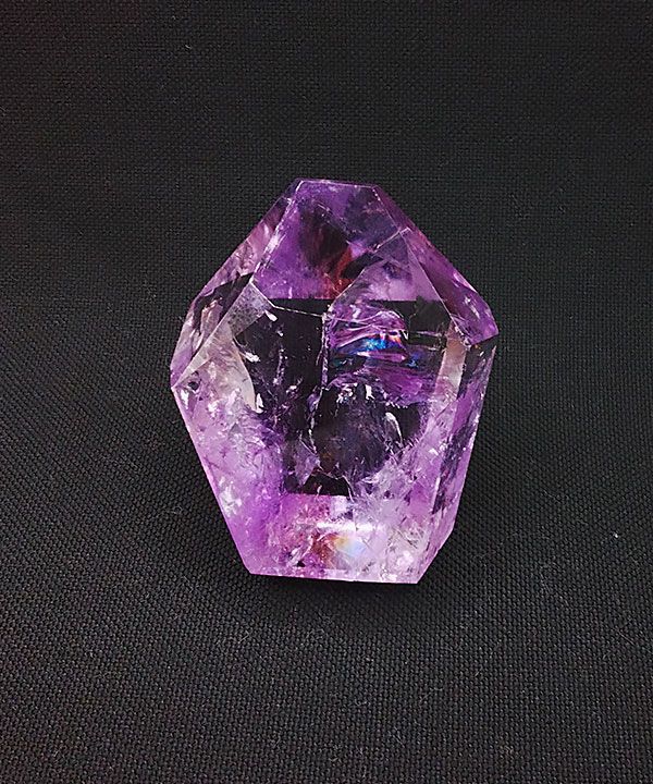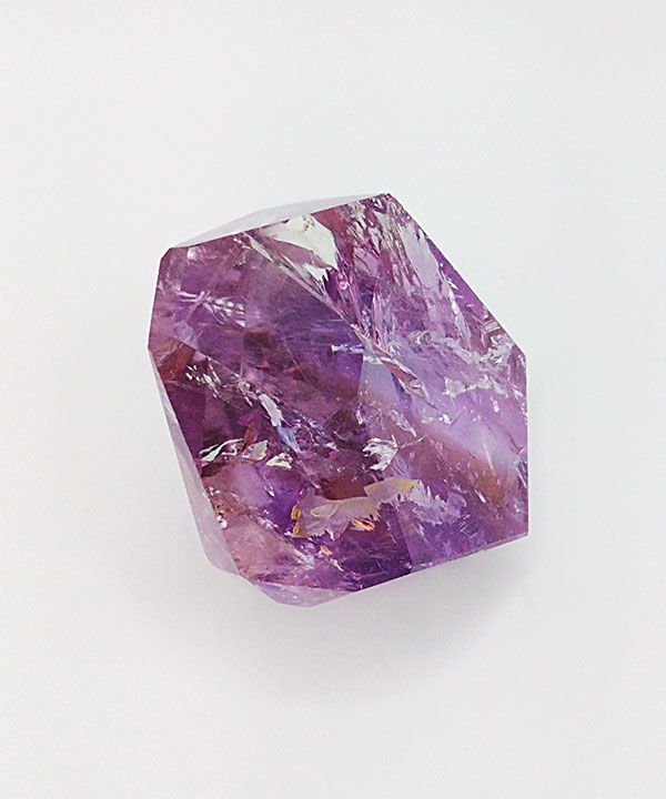 程よいサイズ感と高い透明度をあわせ持つ、バランスの良いブラジル産アメジストの一点ものフリーカット。内側まで澄んだ輝きがあり、光を通すと落ち着いた穏やかな印象を与えてくれます。どんな空間にも自然に馴染み、長く寄り添ってくれるような優しい存在感が魅力です。自然な形に沿って仕上げられた内部には虹色のインクルージョンが浮かび、角度によって七色の光が現れる幻想的な表情を楽しめます。窓辺やライトのそばに置くと虹がより美しく輝き、淡く透明感のある紫が空間にやわらかな彩を添えます。天然石ならではの小さな欠けが虹を生み出しており、その石だけの唯一無二の個性としてお楽しみいただけます。
