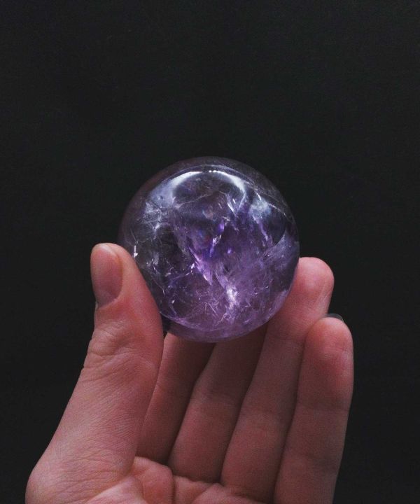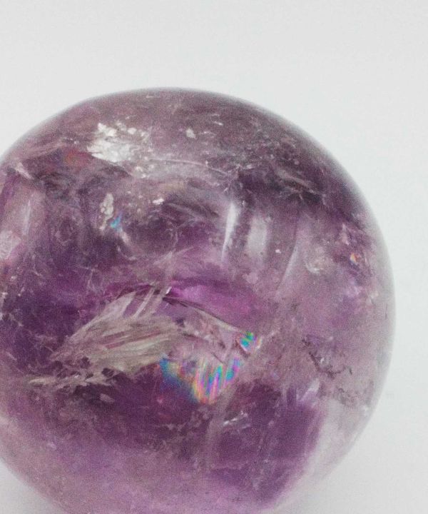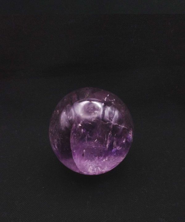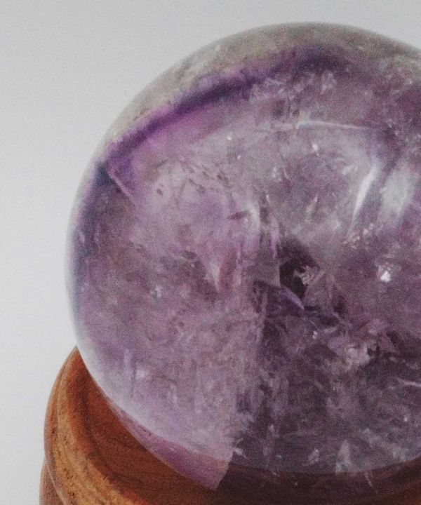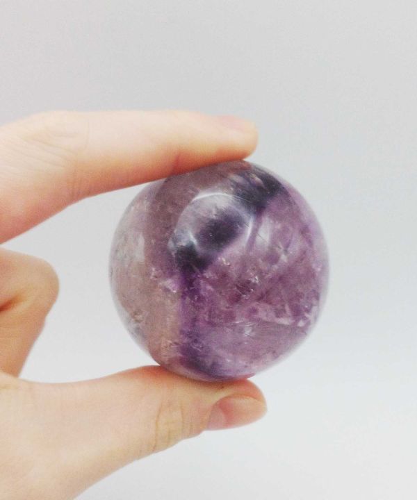 全体を淡い白が包み込み、内側に鮮やかな紫が広がるブラジル産アメジストの一点もの丸玉。柔らかさと華やかさを併せ持ち、空間を優しく彩り、眺めるだけで癒しを感じられます。丸いフォルムは調和や円満を象徴し、お部屋に置くことで安定感をもたらすといわれています。光を受けると柔らかく透き通り、落ち着いたやさしい印象を添えます。インテリアや御守りとしてはもちろん、手に乗せてリラックスする時間を過ごすのにもおすすめです。天然石ならではの内包物や色の濃淡は、自然が生み出した唯一無二の模様としてお楽しみいただけます。