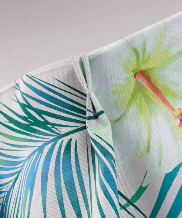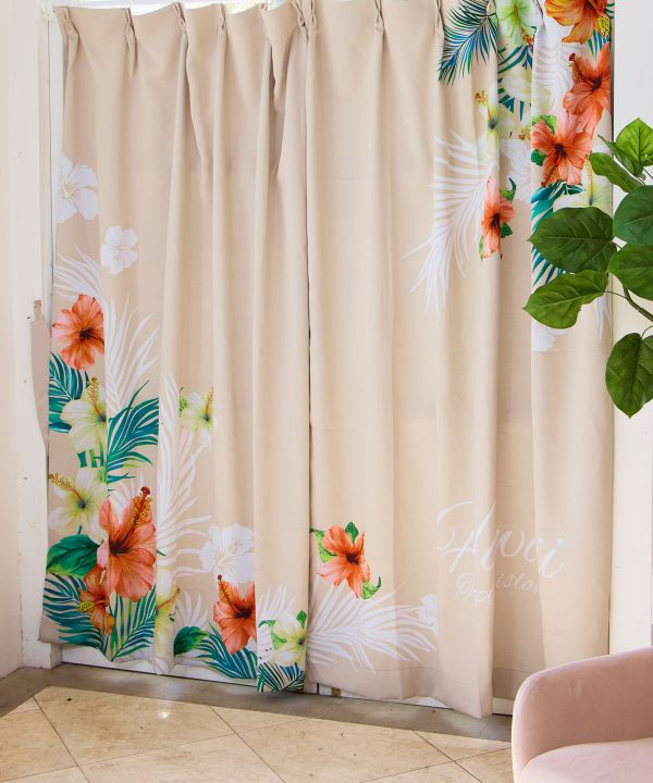 上品なハワイアンリゾートを思わせるデザインのカーテン。空間をやさしく彩りながら、遮光二級と遮熱機能を備えた実用性も魅力です。洗濯可能でお手入れしやすく、タッセルとアジャスターフック付きですぐに使える仕様。