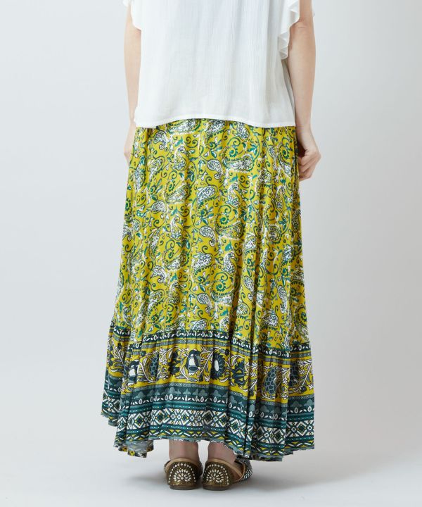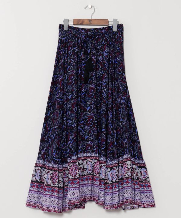 動くたびにふんわりと揺れるシルエットが魅力のロングスカート。繊細なペイズリー柄に、裾のブロックプリント風デザインがアクセント。ウエストはゴム仕様で着心地もらくちん。タッセル付きの紐がさりげないポイントに。トップスをインしたスタイルや、旅先でのリラックスコーデにもおすすめのアイテム。