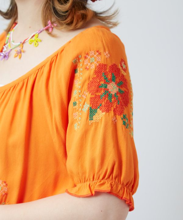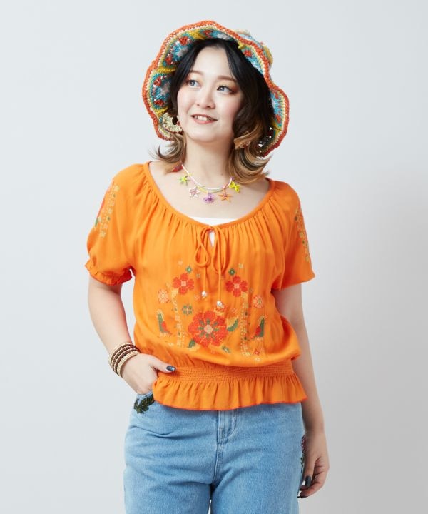 レーヨン素材ならではの落ち感と、ウエストのシャーリングが生み出すメリハリのあるシルエットが魅力のトップス。胸元と袖にあしらわれた鮮やかなクロスステッチが、どこか懐かしくも新鮮なアクセントを添え、洗練されたフォークロアスタイルを演出します。
