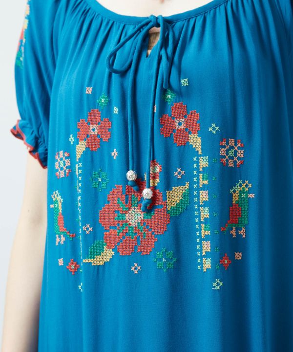 レーヨン素材ならではの落ち感と、ゆったりとしたリラックスシルエットが魅力のワンピース。胸元と袖にあしらわれた鮮やかなクロスステッチが、どこか懐かしくも新鮮なアクセントを添え、洗練されたフォークロアスタイルを演出します。