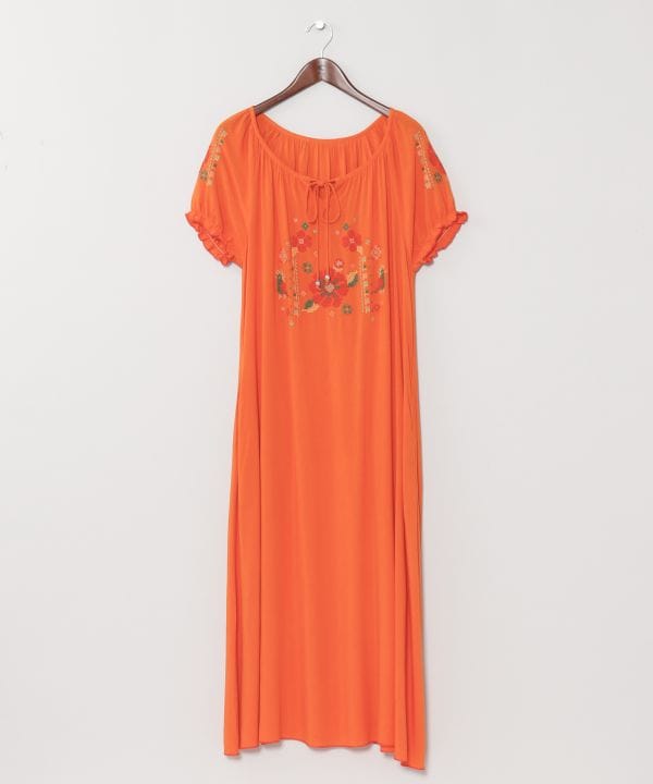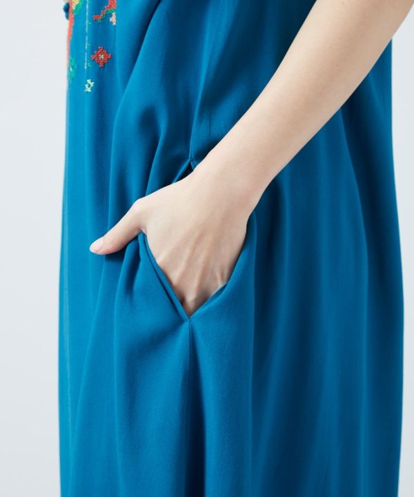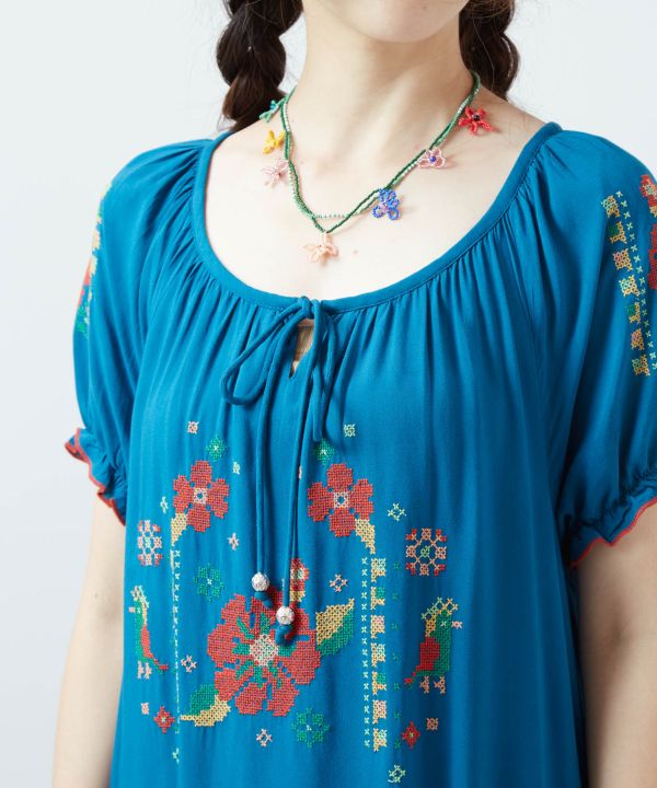 レーヨン素材ならではの落ち感と、ゆったりとしたリラックスシルエットが魅力のワンピース。胸元と袖にあしらわれた鮮やかなクロスステッチが、どこか懐かしくも新鮮なアクセントを添え、洗練されたフォークロアスタイルを演出します。