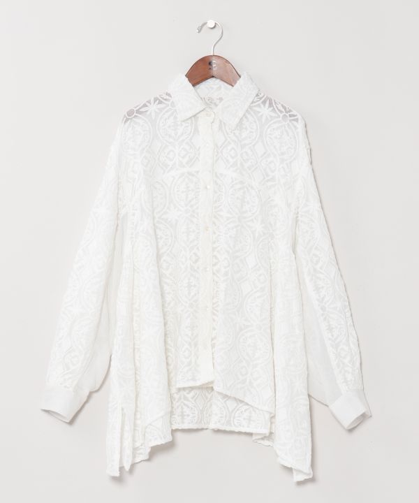細い糸を密に織り上げた、軽やかで透け感のある風合いが魅力のシャツ。贅沢な総刺繍が織りなす繊細な表情が、シンプルの中に品のある佇まいを演出します。さらりとした肌触りで日常の着こなしにベーシックに活躍するアイテムです。