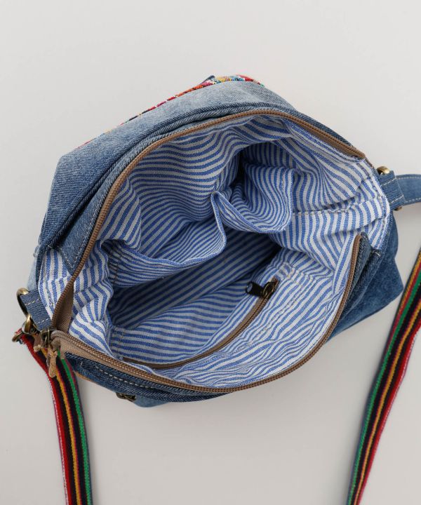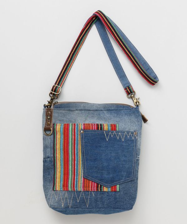リサイクルジーンズを使用しており、 色落ちがそれぞれ違う一点物感を楽しめる。 遊び心のある刺繍がポイント。 使い込む程、味の出てくるこだわりのショルダーBAG。※柄が一つ一つ異なるアソート商品です。
