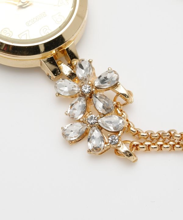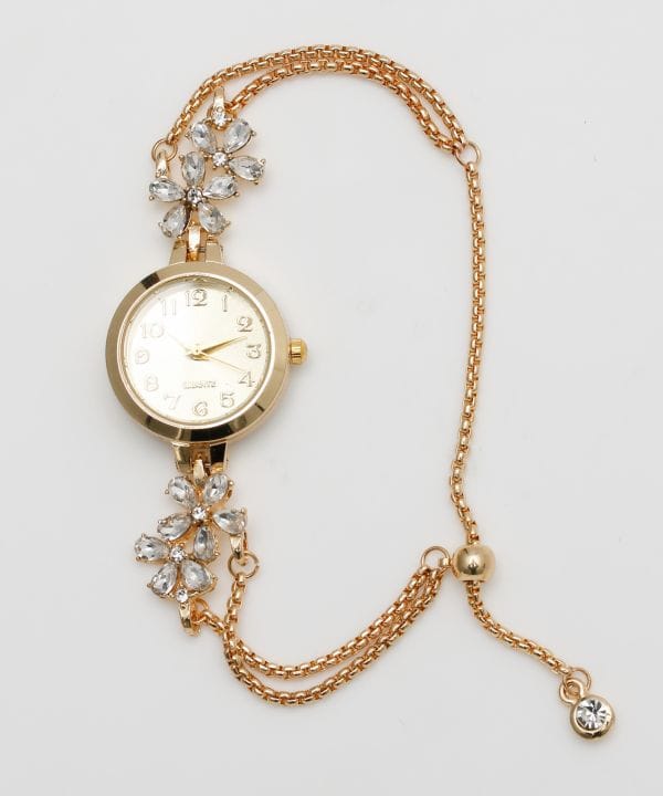 神様が宿る花と伝えられるプルメリアをあしらったビジュー腕時計。小ぶりな文字盤ときらめく装飾が女性らしい手元を演出します。華奢な印象でブレスレット感覚でも身に着けられます。