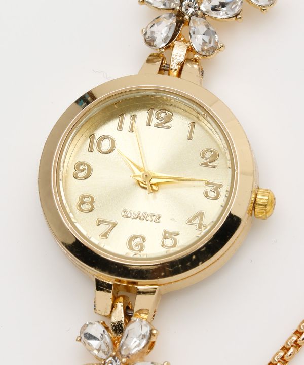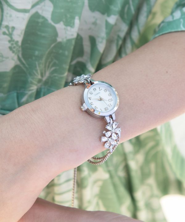 神様が宿る花と伝えられるプルメリアをあしらったビジュー腕時計。小ぶりな文字盤ときらめく装飾が女性らしい手元を演出します。華奢な印象でブレスレット感覚でも身に着けられます。