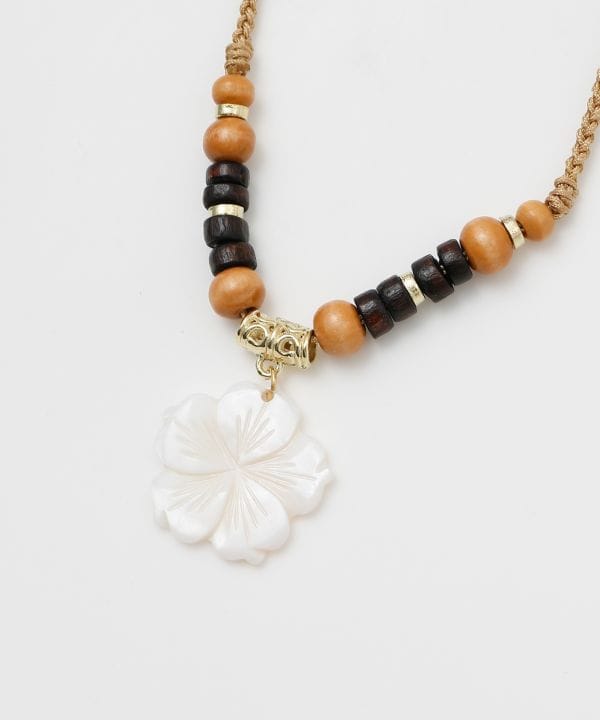 シェルモチーフと天然素材を組み合わせたナチュラルなネックレス。ハワイの海や大地を思わせる素材感が胸元を爽やかに彩ります。異なる質感のパーツが絶妙に調和し、コーディネートにさりげない存在感をプラス。リゾートスタイルにおすすめです。