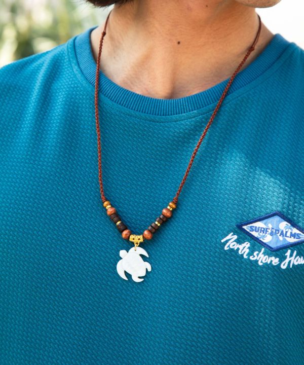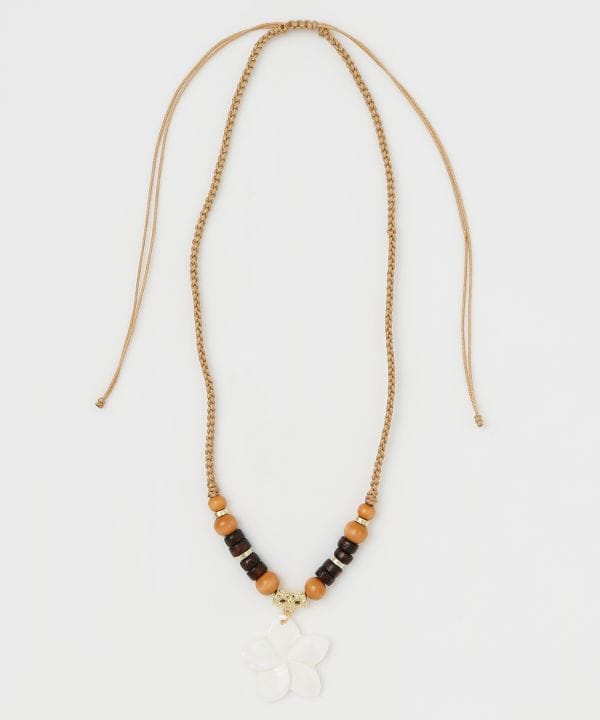 シェルモチーフと天然素材を組み合わせたナチュラルなネックレス。ハワイの海や大地を思わせる素材感が胸元を爽やかに彩ります。異なる質感のパーツが絶妙に調和し、コーディネートにさりげない存在感をプラス。リゾートスタイルにおすすめです。