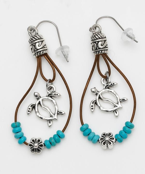 ターコイズとハワイアンモチーフを組み合わせたシンプルなピアス。揺れるデザインが特徴で、水にぬれても錆びにくい金具を使用し、デイリーからリゾートシーンまで活躍。