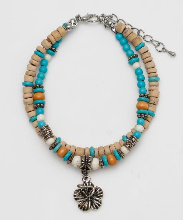 ハイビスカスモチーフをあしらったアンクレット。ハワイで神様にささげる花とされるデザインが足元に華やぎを添えます。天然素材のナチュラルな風合いが涼やかな印象を演出し、サンダルや素足に映えるアクセントに。