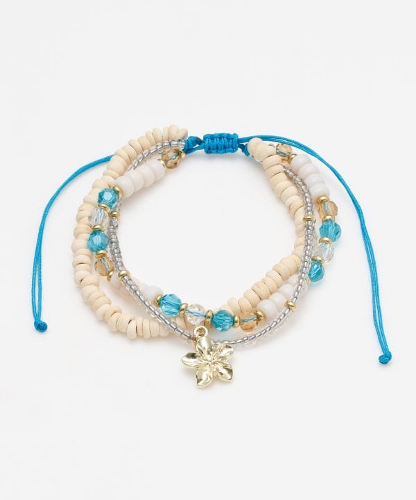 ハワイで愛されるプルメリアをモチーフにしたアンクレット。ガラスやウッドなどの天然素材ビーズを組み合わせ、ほどよいボリューム感と涼やかな表情を演出します。足元で揺れる花モチーフがサンダルスタイルに映え、リゾートムードをさりげなくプラスしてくれるデザインです。