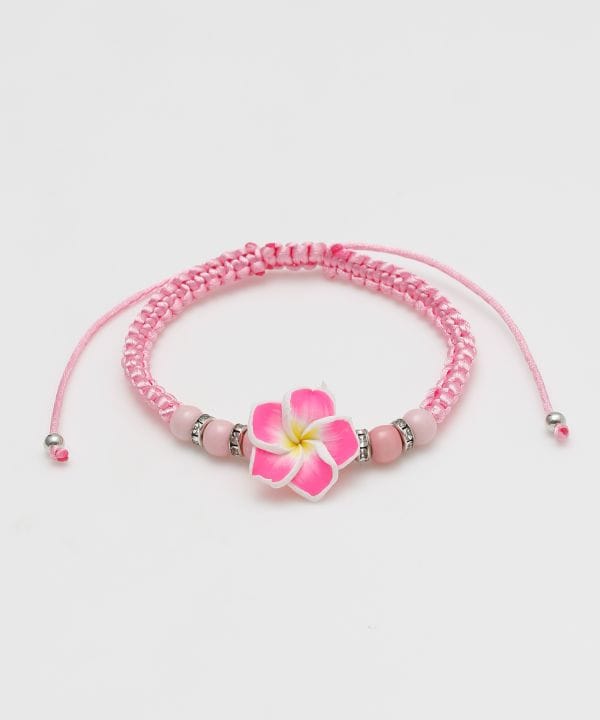 ハワイで神が宿る花とされるプルメリアをモチーフにしたブレスレット。カラフルな紐と花の組み合わせが、お土産のような温もりあるデザインです。華奢な印象で重ね付けにもおすすめ。手元にさりげなくハワイの彩りを添えてくれるアイテムです。