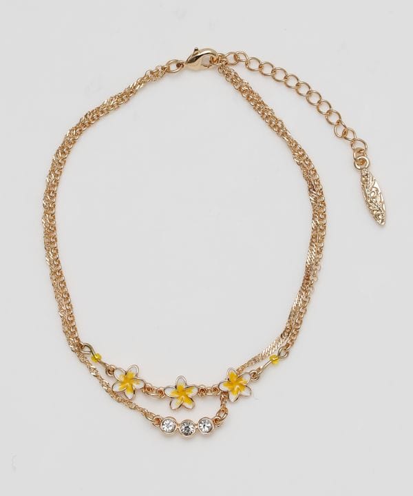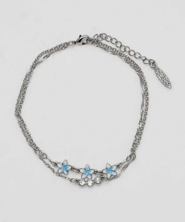 神が宿る花として愛されるプルメリアをあしらったアンクレット。華奢なチェーンに揺れるモチーフが足元を上品に彩ります。さりげない輝きがサンダルスタイルに映え、女性らしいリゾートムードを演出。日常にも取り入れやすいデザインです。