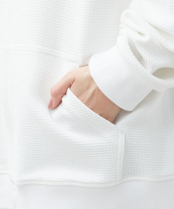 ふくれジャカード素材で仕立てたメンズフードパーカー。表情豊かな凹凸生地に、サーフ感のある刺しゅうとプリントを組み合わせたデザインが魅力です。程よいボリューム感で羽織りやすく、デニムやハーフパンツと合わせてハワイの空気を感じるカジュアルスタイルにおすすめです。