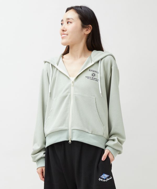ワッフル調素材のジップアップフードパーカー。凹凸のある生地がさらりとした着心地を叶え、ヴィンテージ感漂うたっぷりとした刺しゅうが存在感を放ちます。ファスナー仕様でさっと羽織れるため、レイヤードスタイルにも便利。デイリーからリゾートまで活躍する一着です。