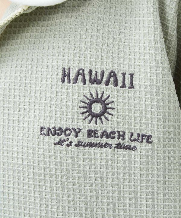 ワッフル調素材のジップアップフードパーカー。凹凸のある生地がさらりとした着心地を叶え、ヴィンテージ感漂うたっぷりとした刺しゅうが存在感を放ちます。ファスナー仕様でさっと羽織れるため、レイヤードスタイルにも便利。デイリーからリゾートまで活躍する一着です。