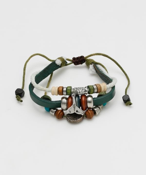 レザーコードにウッドやメタルパーツを組み合わせたブレスレット。サーフテイストを感じさせるデザインで、手元にナチュラルな存在感をプラスします。サイズ調整ができ、デイリー使いにも取り入れやすいアイテムです。