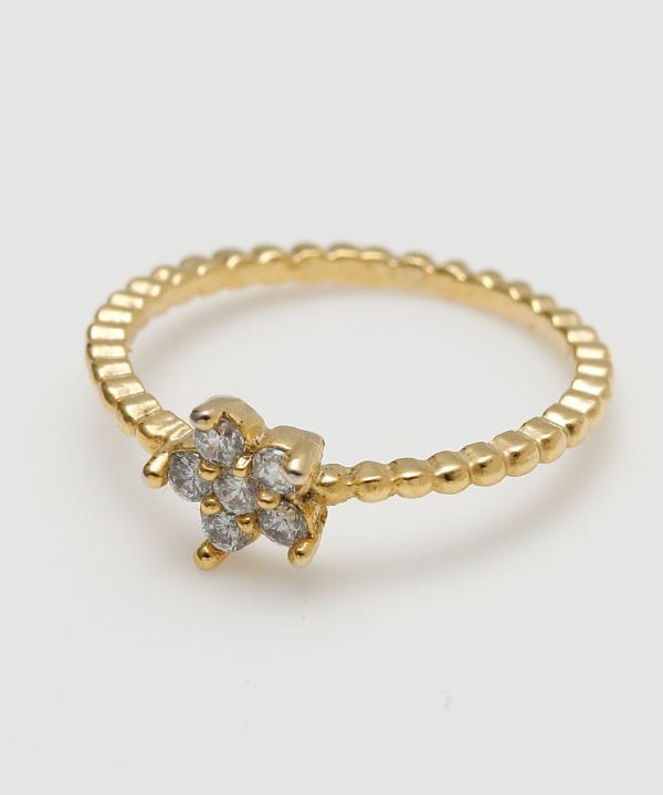 繊細なビーズラインにフラワーモチーフを添えたリング。可憐なデザインが指先にやわらかな華やぎをプラスします。デイリーにも取り入れやすい上品な仕上がりです。