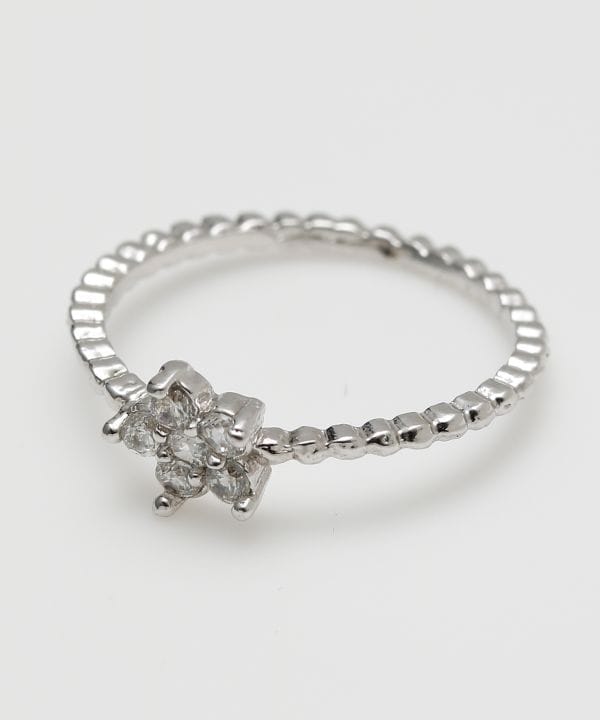 繊細なビーズラインにフラワーモチーフを添えたリング。可憐なデザインが指先にやわらかな華やぎをプラスします。デイリーにも取り入れやすい上品な仕上がりです。