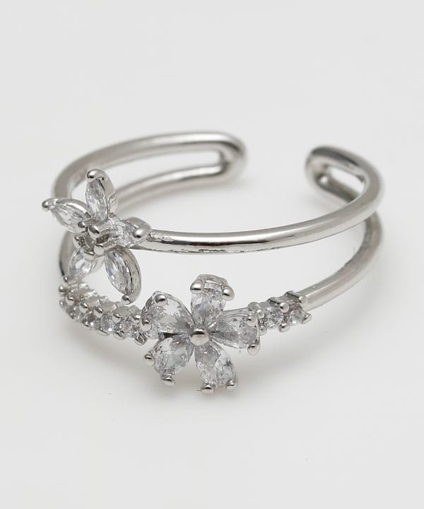 繊細なフラワーモチーフが連なるリング。きらめくストーンが指元を華やかに彩り、女性らしい印象を演出します。重ね付けにもおすすめのデザインです。