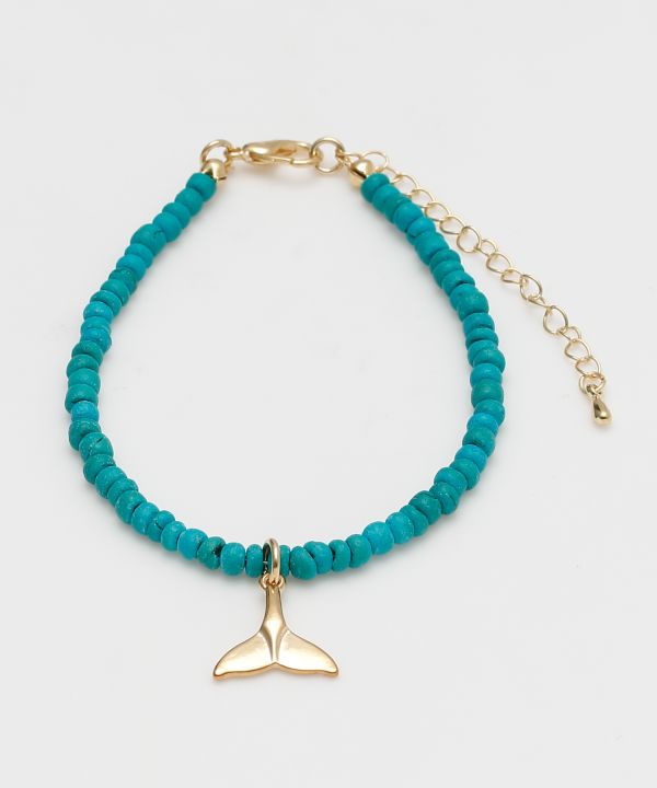 ホエールテールモチーフが揺れるブレスレット。ナチュラルとブルーのビーズが海を感じさせ、コーディネートに軽やかな印象を与えます。