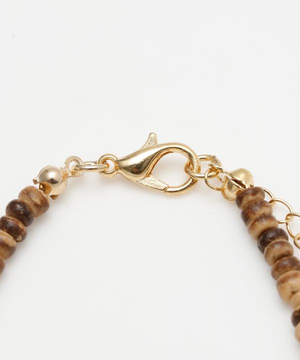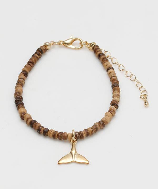 ホエールテールモチーフが揺れるブレスレット。ナチュラルとブルーのビーズが海を感じさせ、コーディネートに軽やかな印象を与えます。