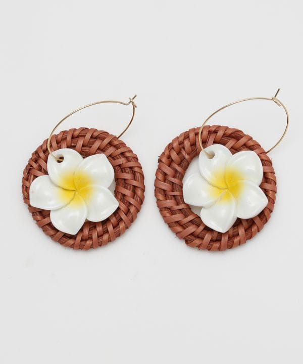 ラタン素材にプルメリアをあしらったピアス。軽やかなつけ心地で、リゾート感あふれるデザインが魅力。コーディネートに季節感を添えてくれます。