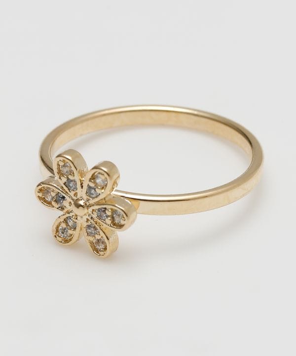 繊細なプルメリアモチーフが可憐に咲くリング。さりげなく輝くストーンが指先を華やかに彩ります。