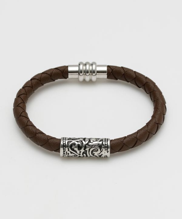 編み込みレザーにメタルパーツを合わせたブレスレット。落ち着いたカラーで、カジュアルにもきれいめにも合わせやすいデザインです。