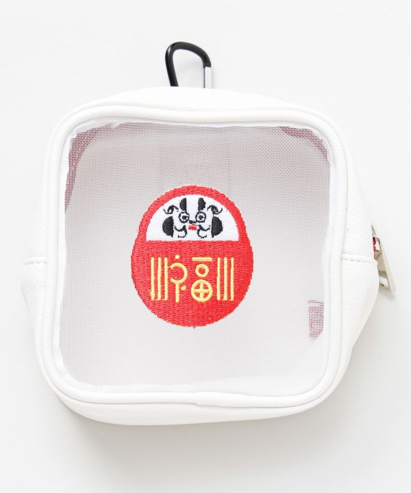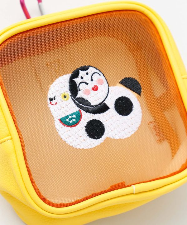 涼やかなメッシュ素材のスクエア型ポーチ。日本の民芸モチーフをワンポイントの刺しゅうであしらました。中身がほどよく見える軽やかなデザインで、小物の整理にも便利。カラビナ付きでバッグやベルトに取り付けられ、持ち歩きにも活躍します。