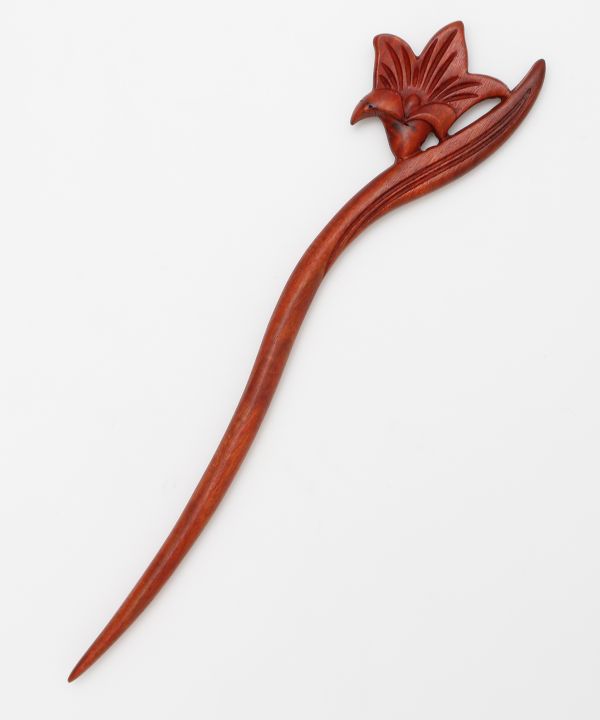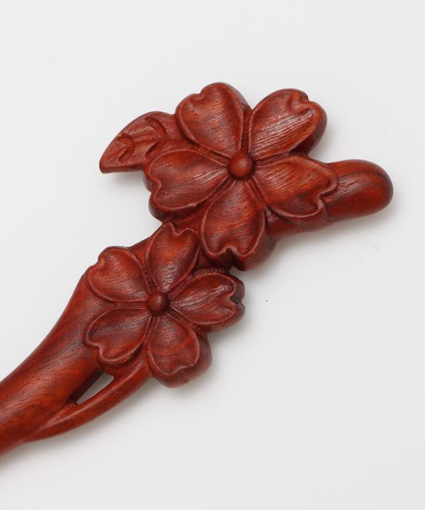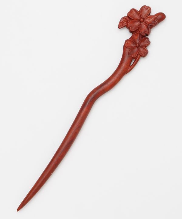 木そのものの風合いを活かした木彫りのかんざし。日本を象徴する花々がモチーフ。なめらかでしっかりとした軸が髪を安定してまとめ、一本挿すだけで上品な仕上がりに。